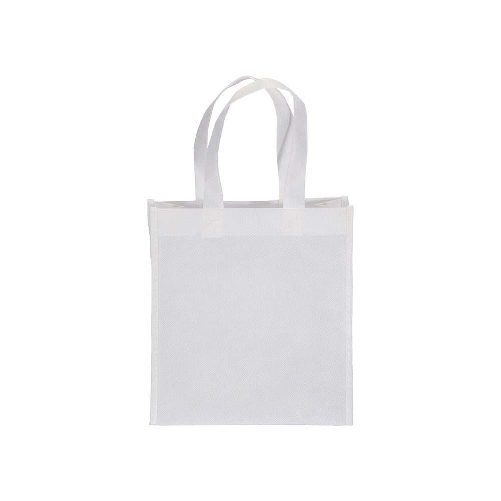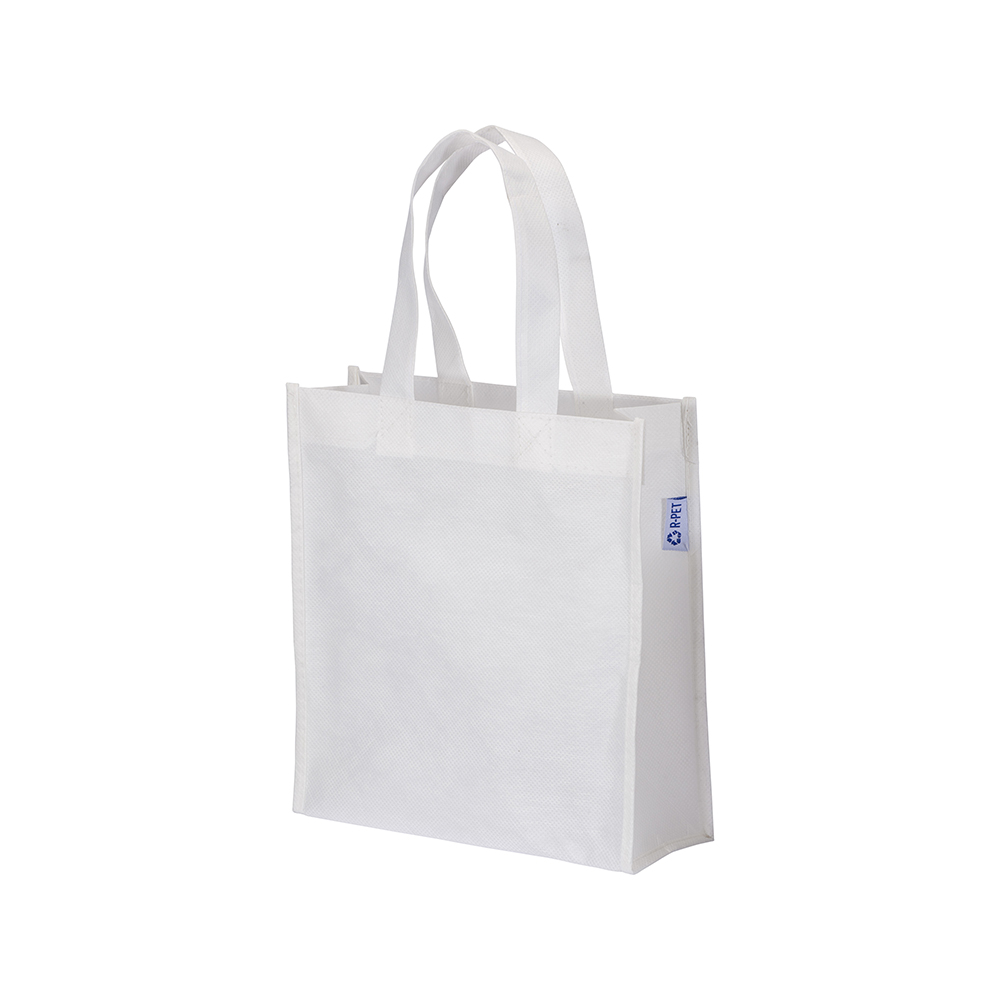 Shopper mini con soffietto in R-pet 80 g/m2 cucita, manici corti.