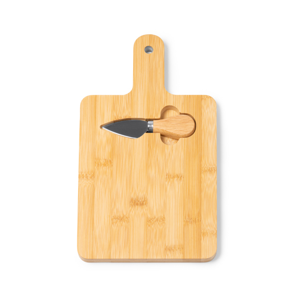 Il tagliere in bamboo è dotato di un'impugnatura per un uso confortevole. Include un coltello speciale da formaggio in acciaio inox, ideale per una preparazione e un servizio eleganti. Dimensioni: cm 31x17,5x1,4